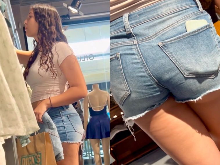 Hot teen showing cheeks in shorts shopping with mom