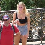 Cute candid blonde teen in denim shorts and a black top showing some cleavage