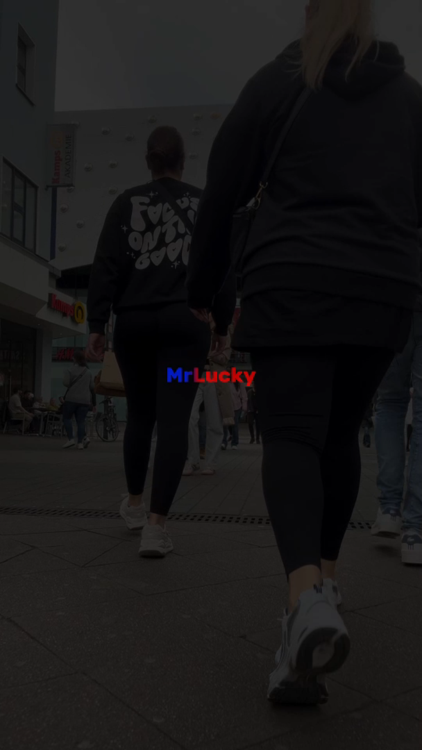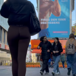 Brunette in tight black leggings and white sneakers in the mall