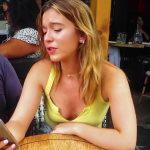 Cute candid blonde girl showing some cleavage in a little yellow top