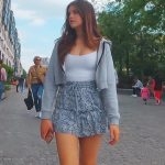 Cute candid brunette teenie showing some cleavage in a white top and skirt