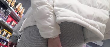 Candid hottie with a sexy mound sitting lady like in purple spandex
