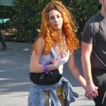 Candid babe with fire red hair showing some cleavage while out with her man