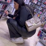 Candid sexy babe with a bubble in leggings shopping for new glasses