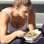 Candid pretty girl sitting and eating lunch while showing her sexy cleavage
