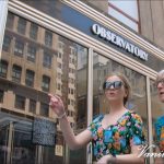 Blonde Teen Tourist in Green Black Floral Dress