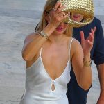 Quick clip of a candid braless blonde gold digger with small tits showing pokies in a dress