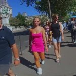 Candid blonde teen showing cleavage in a little pink skirt while out with her parents