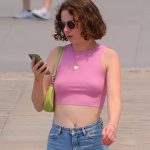 Cute candid braless blonde girl in a purple top with some jiggle as she walks