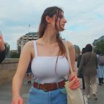 Candid brunette girl with some big titties in a tight white top