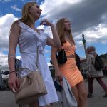 Hot candid babe with a nice ass in a tight little orange skirt while out with her cute friend