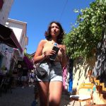 Hot candid babe sitting in an orange skirt while showing her sexy cleavage