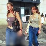 Two candid busty babes with tits bouncing as they walk