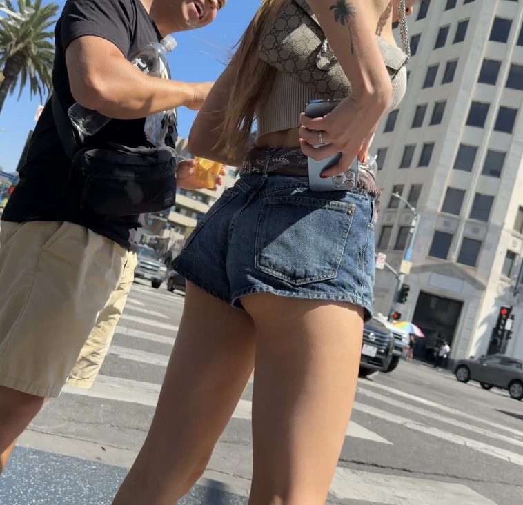 Hot teen showing cheeks in shorts shopping with mom