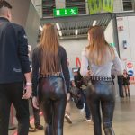 Touching tight wetlook leggings ass power