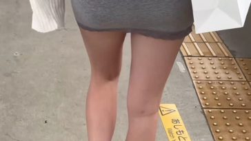 Sexy asian girl candid in mini skirt grey with high socks transparent