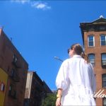 Brunette in Flowy White Blouse-Type Dress